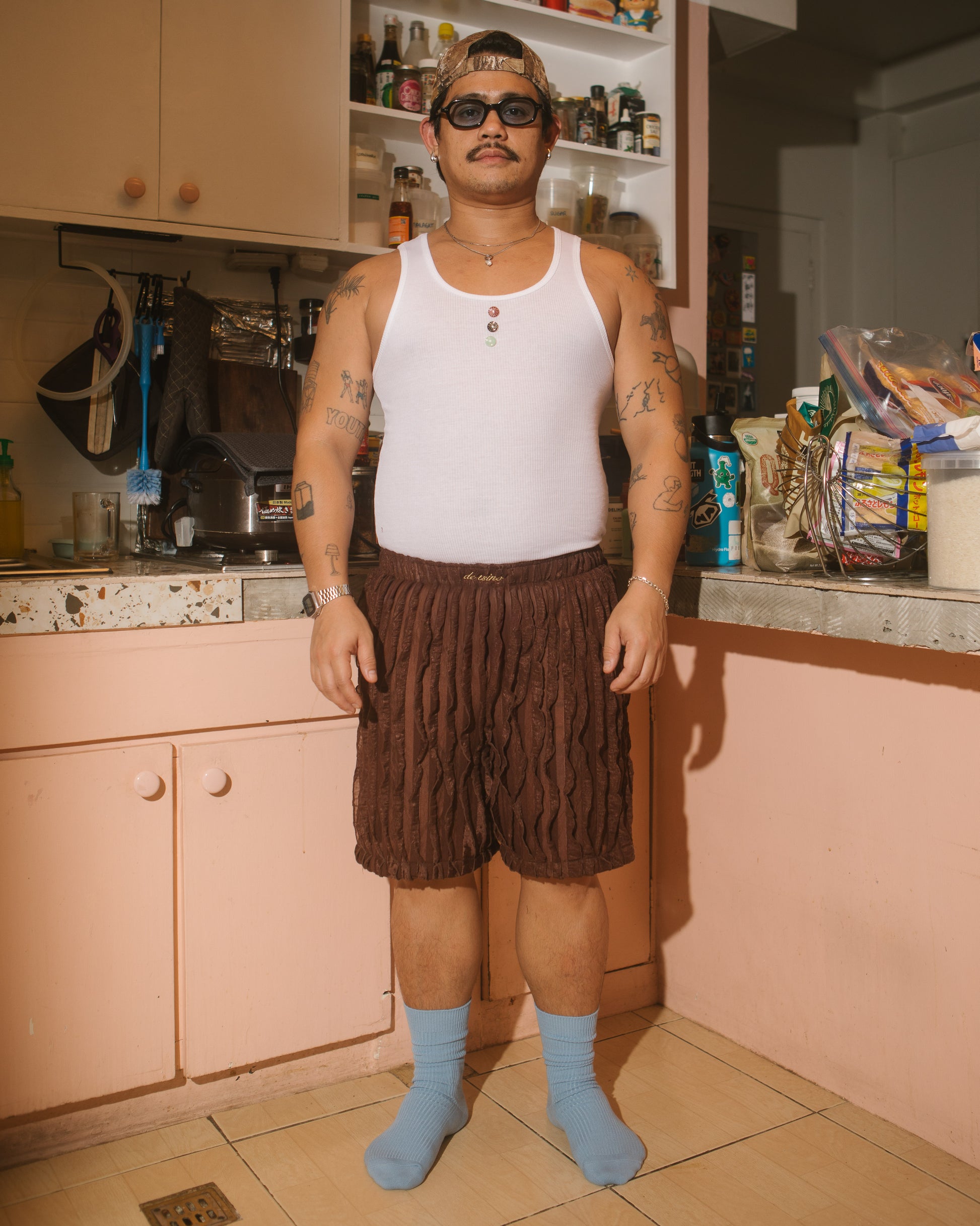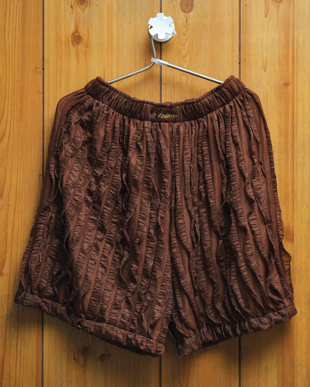 Mid-length shorts made from lightweight loose plisse fabric with a natural crinkled texture. Designed with a with leg and elastic waistband for everyday comfort and movement. Slight variations or softened pleats may appear due to the nature of the deadstock plissé fabric. One size fits most.